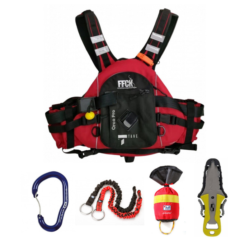 PACK MONITEUR / MONITRICE FFCK - Pack de sécurité incluant gilet moniteur/monitrice FFCK, couteau, corde de sécurité, leash, mousqueton.